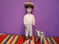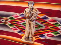 FC-5: Mexican vintage folk art and woodcarving, a wonderful woodcarving of a Mexican paisano by the master carver Manuel Jimenez of Oaxaca, c. 1950's. The piece is beautifully carved and has articulated arms. Condition is very good. Size: 11 inches high including the sombrero by 3 1/2 inches wide by 3 inches deep (front to back). Price: $399.