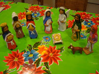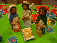 CO-7: Mexican vintage folk art, and Mexican vintage pottery and ceramics, a very colorful and wonderful pottery piece depicting the Flight Into Egypt of the Holy Family, Ocumicho, Michoacan, c. 1960's. Mary is riding a burro and is accompanied by St. Joseph. Angels lead the way. This is a great piece of vintage Mexican folk art! Condition is very good. Size: 9 1/2 inches high by 10 1/4 inches wide by 7 inches deep (front to back). Price: $350.
