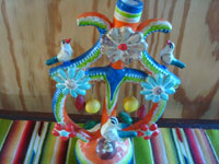 EZ-3: Mexican vintage folk art and pottery, a beautiful tree-of-life featuring a lovely flamingo and wonderful floral decorations and birds, Izucar de Matamoros, Puebla, c. 1950's. Colors are bright and vibrant! This is a great piece of Mexican vintage folk art. Condition is very good. Size: 12 3/4 inches high by 6 inches wide at the widest part. The circular base is 4 1/16 inches diameter. Price: