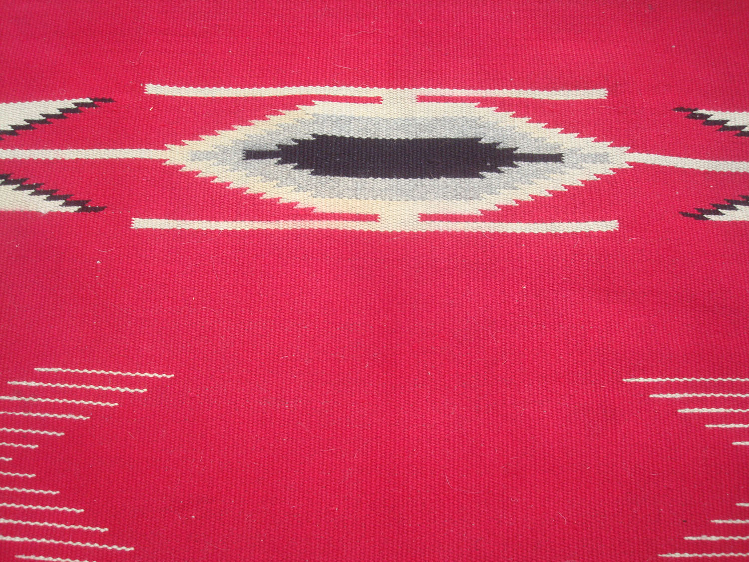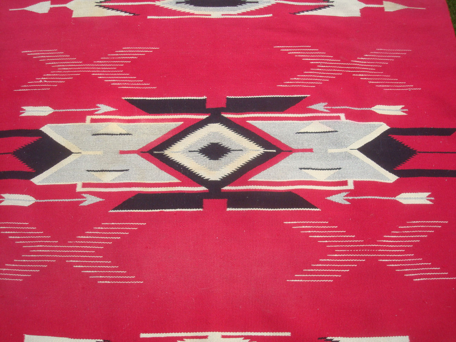 FG-1: Mexican textiles and sarapes, and New Mexican vintage textiles, a beautiful Chimayo textile with a tight weave and beautiul designs, Chimayo, New Mexico, c. 1930-40's. The textile has a wonderful red background and is decorated with arrows.